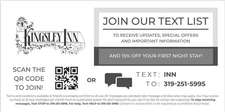 We're excited to announce we have a NEW text club for the Kingsley Inn!! By joining this club you will receive: