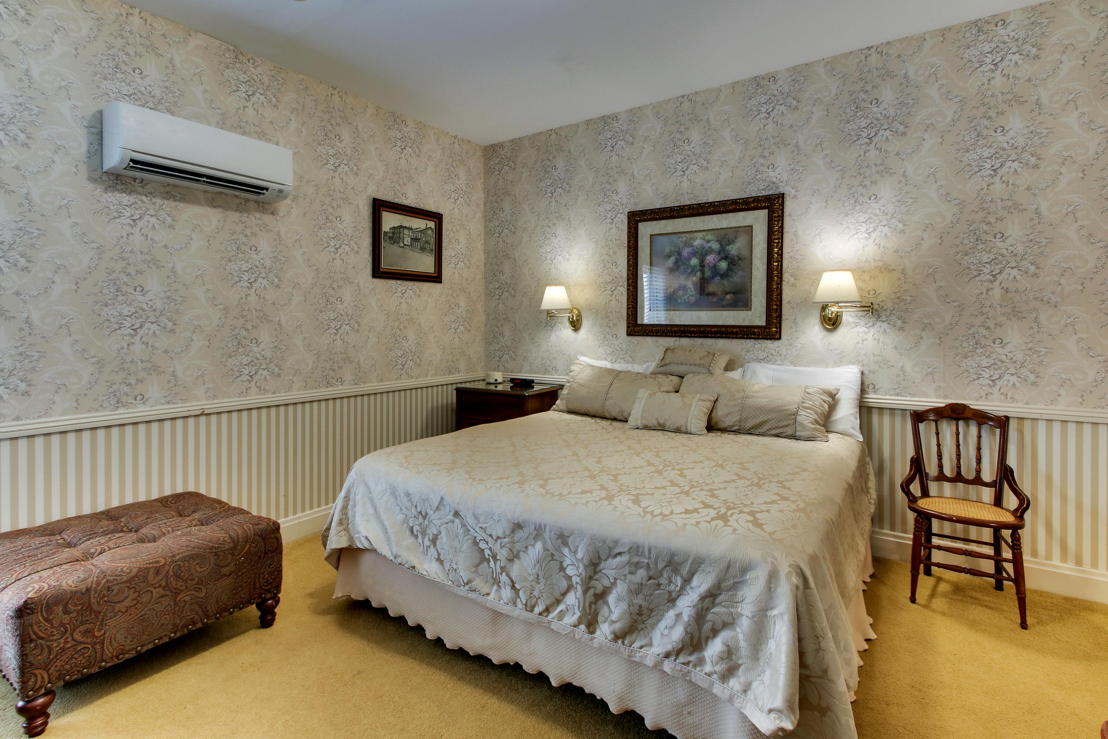 This room has a king sized bed, comfy chair with ottoman, is directly across from the parlor and adjoins to room 209. (Book together for a suite price!) 252 square feet.