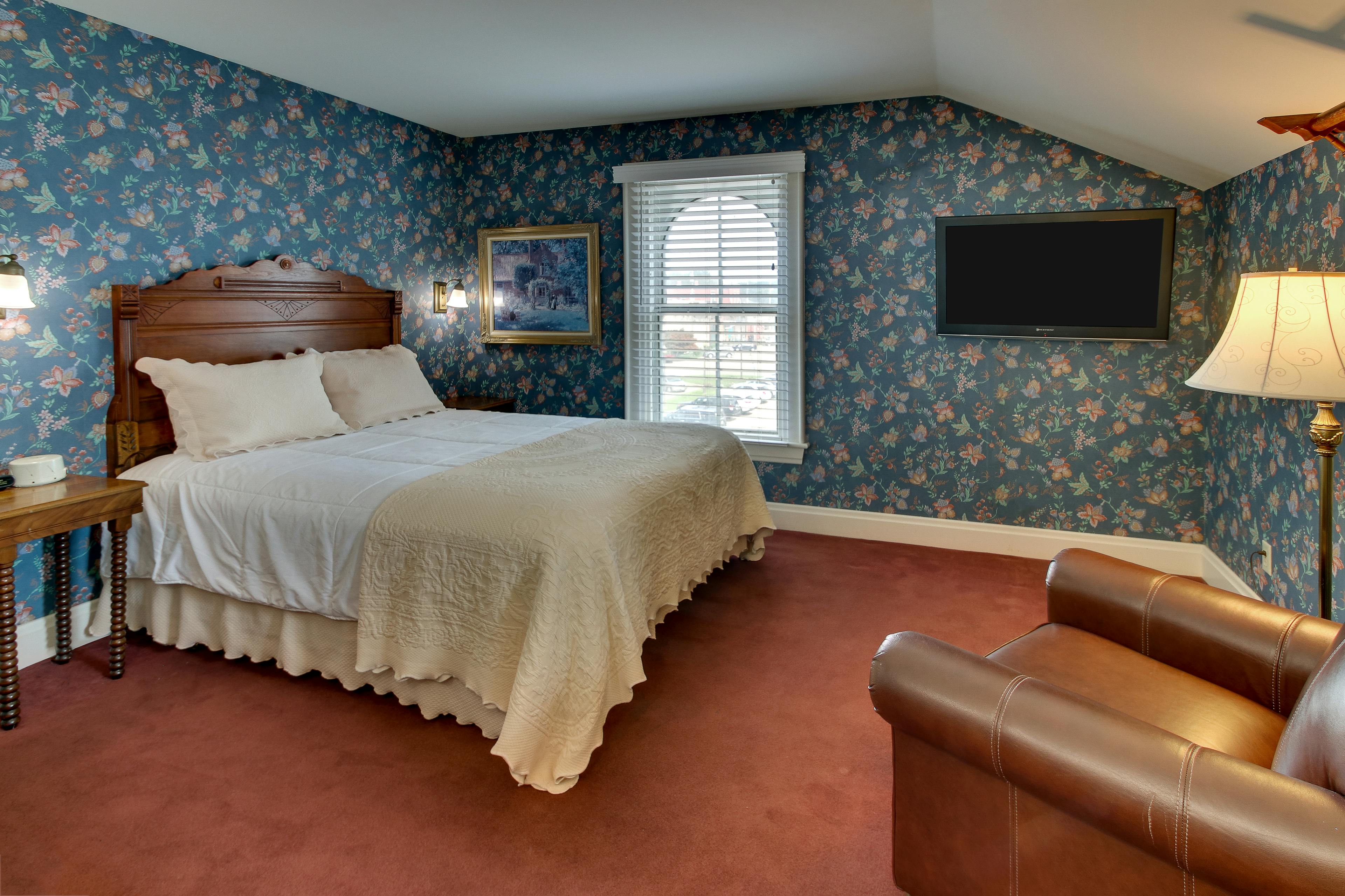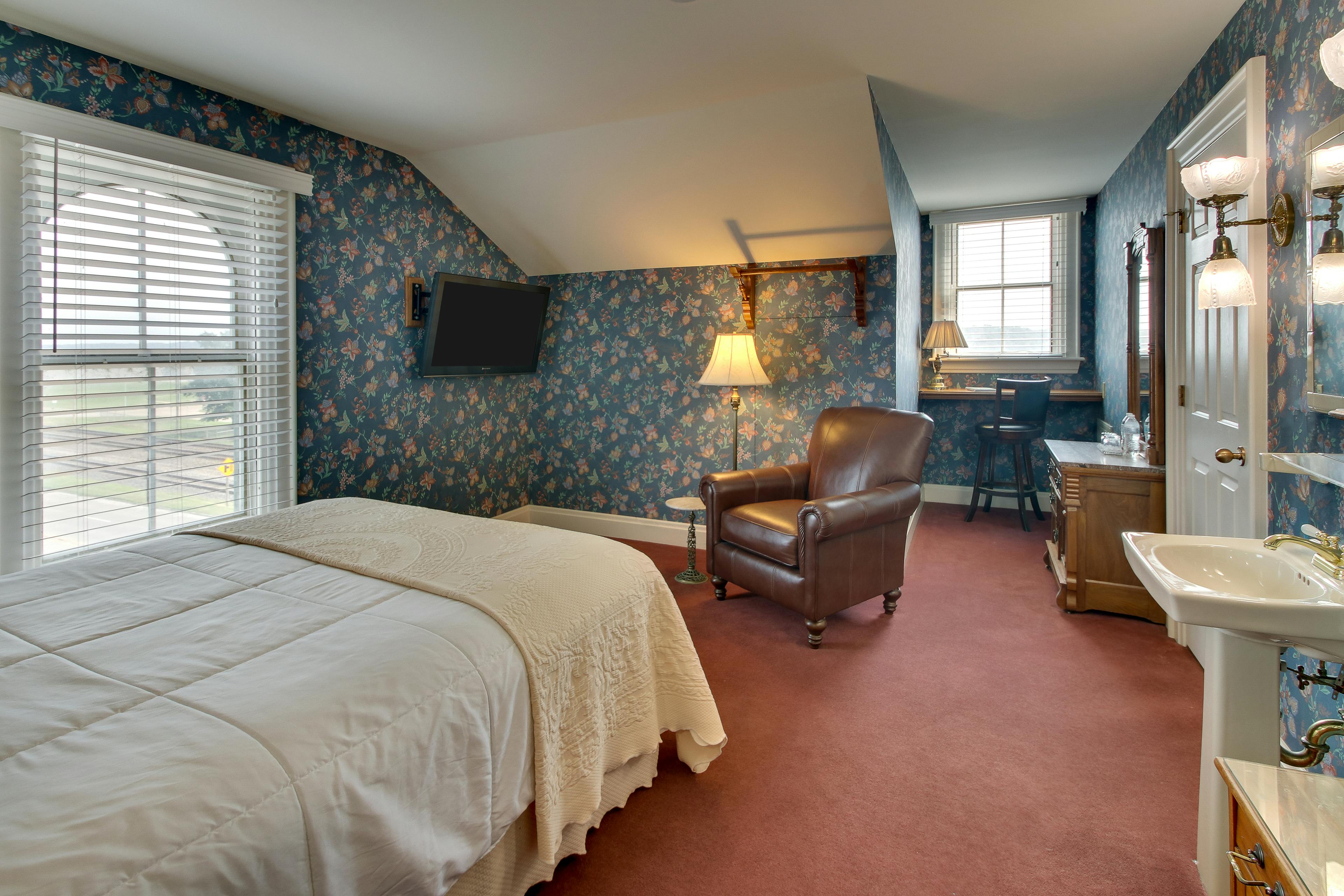 Great things come in little packages! It’s the smallest room on the property, but has a great view of the Bridge, Santa Fe Locomotive #2913, and the Mississippi riverfront. This charming room has a queen bed, leather chair and great views. 218 square feet.