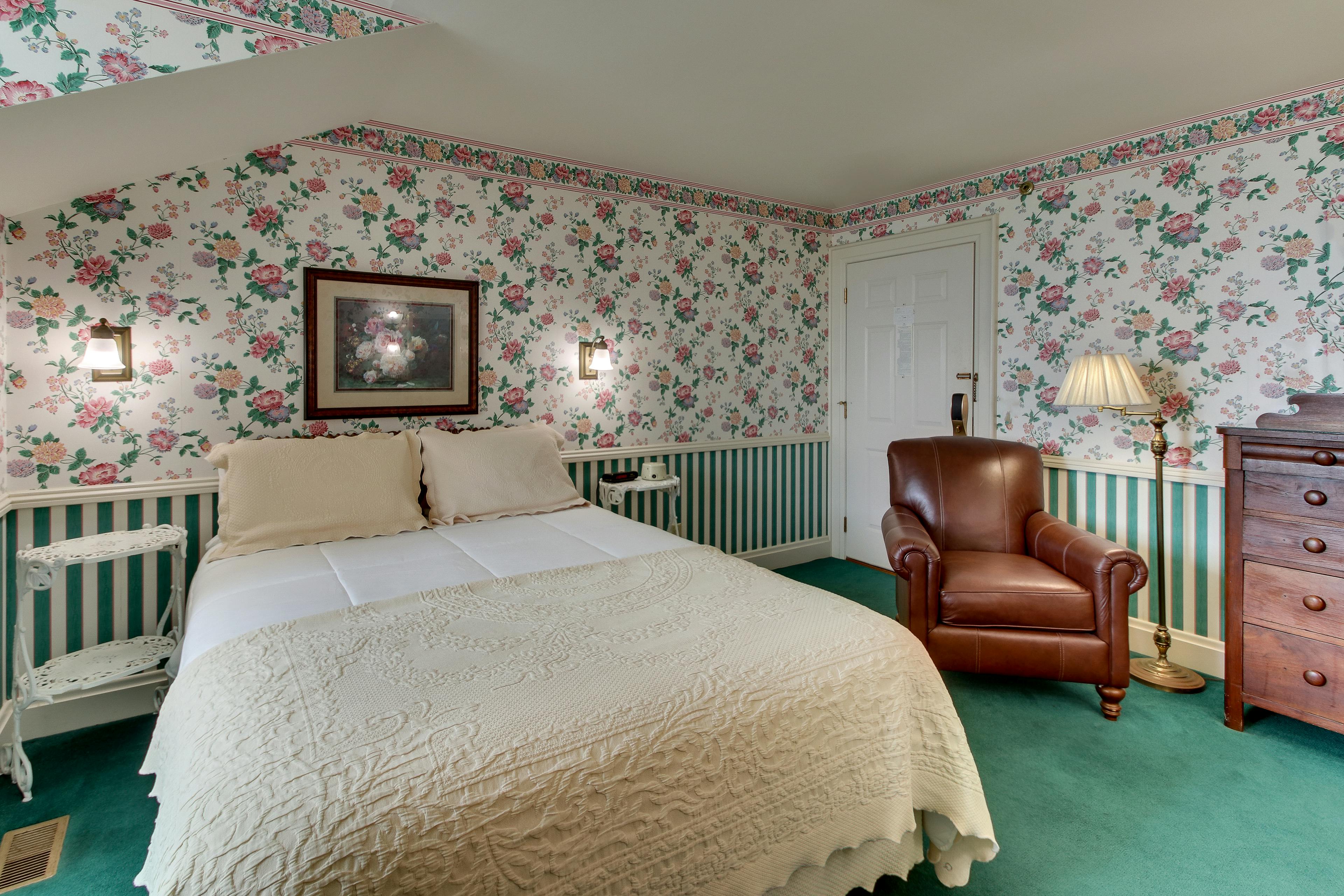This riverfront room has a queen bed with antique spool headboard, leather chair and a light and airy decor with a cottage feel. 231 square feet.