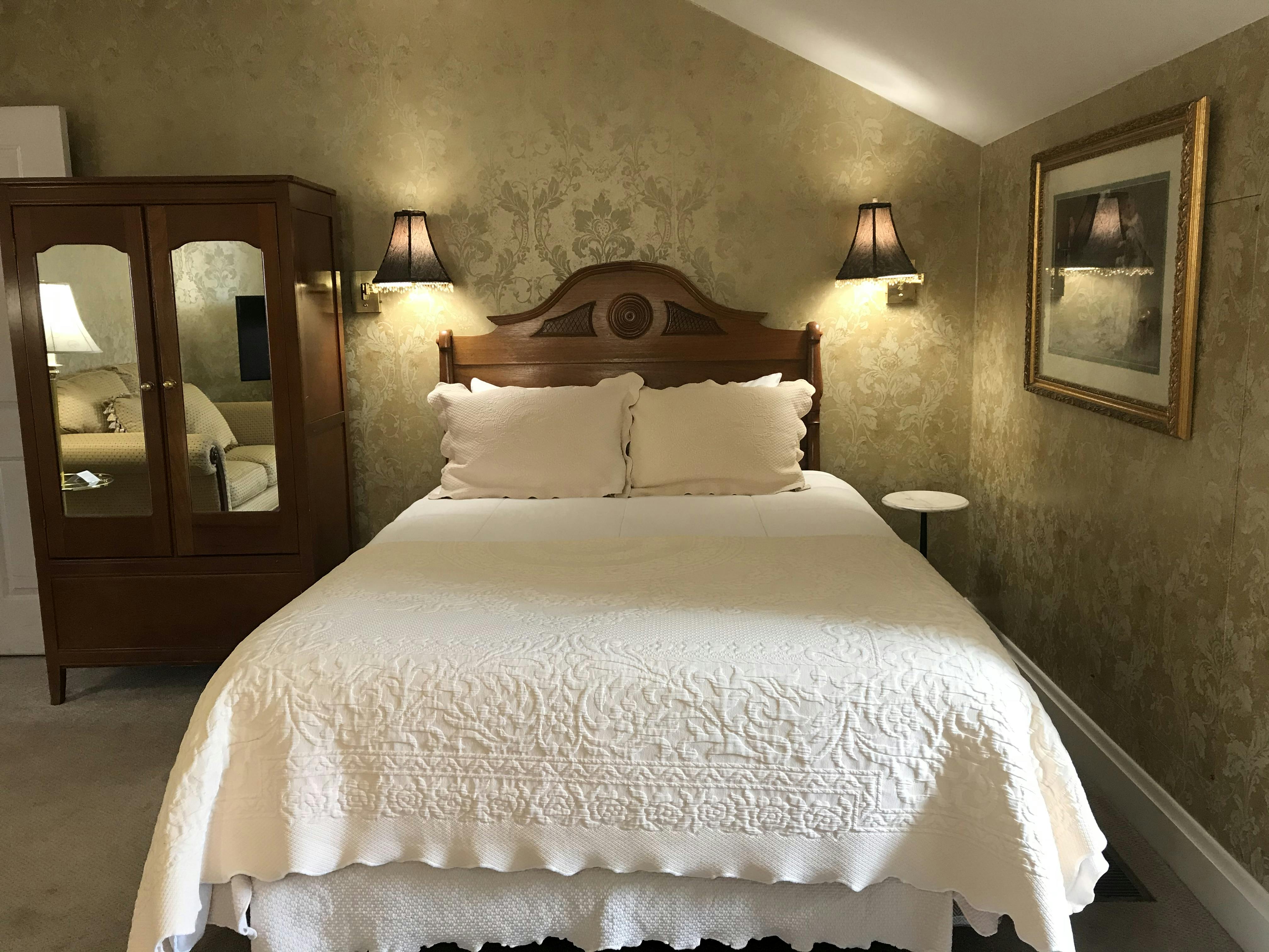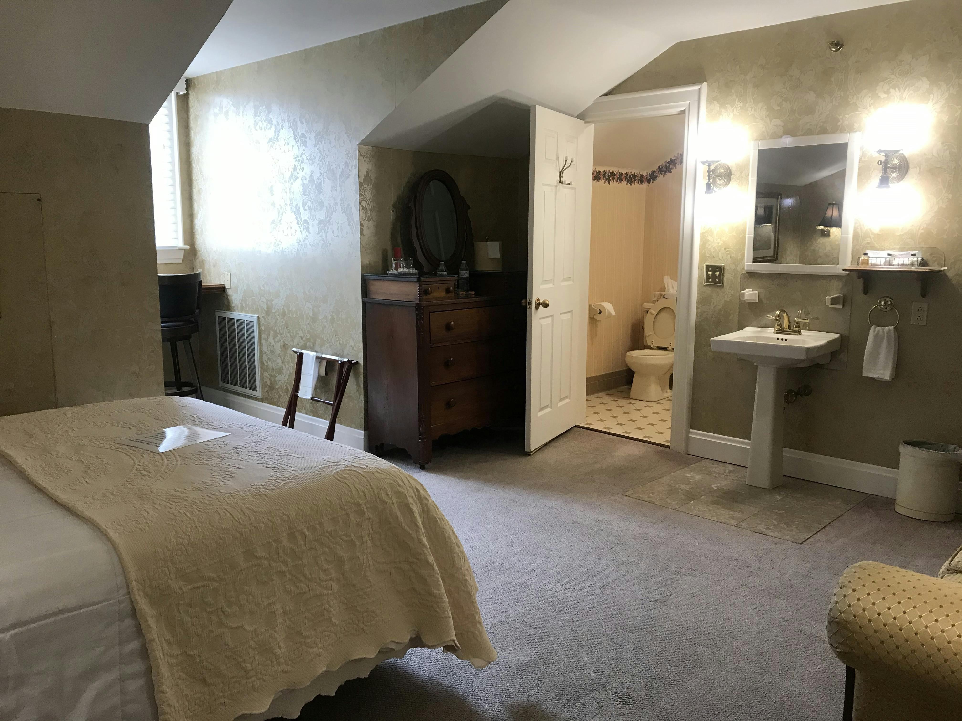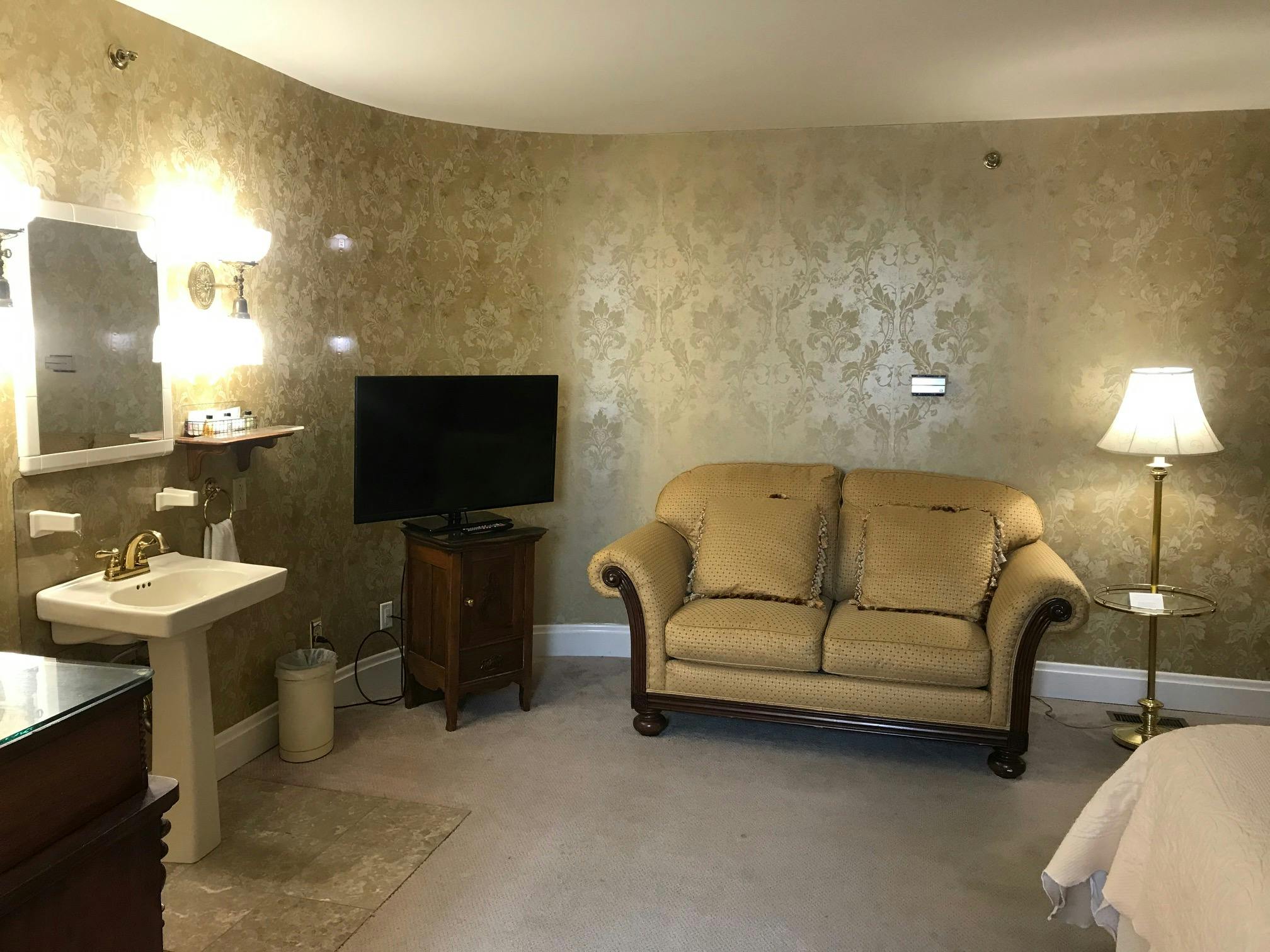 This large, unique room with a queen sized bed and rounded corner is very tastefully appointed. Enjoy the river view from the gabled window as the light bounces off of the golden walls. The rich, gold accent color can be found on the walls, love seat and the sconces. 279 square feet